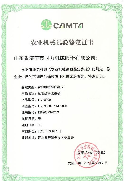 祝贺我司获得山东省农业机械试验鉴定证书